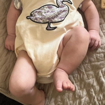 This romper is just too cute! The duck embroidery adds a fun twist to the camo print. Not only does it look adorable, but it's also super comfy for my little one. She can move around easily in it, thanks to the stretchy material. Perfect for summer!